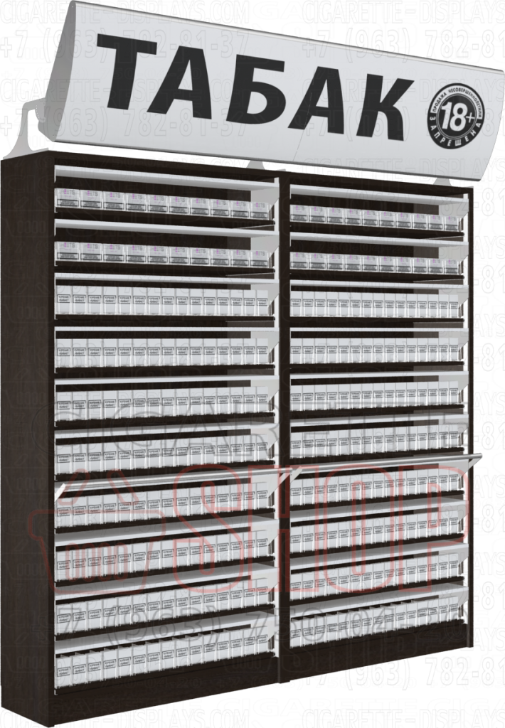 | SIGAR-LDSP-20-AVT-TANDEM-LIGHTBOX-Х2-18 | Шкаф тандем для табачных изделий с десятью уровнями полок с синхронными створками на 360 позиций сигарет на 3960 пачек шириной 2514 мм | 100 000 |